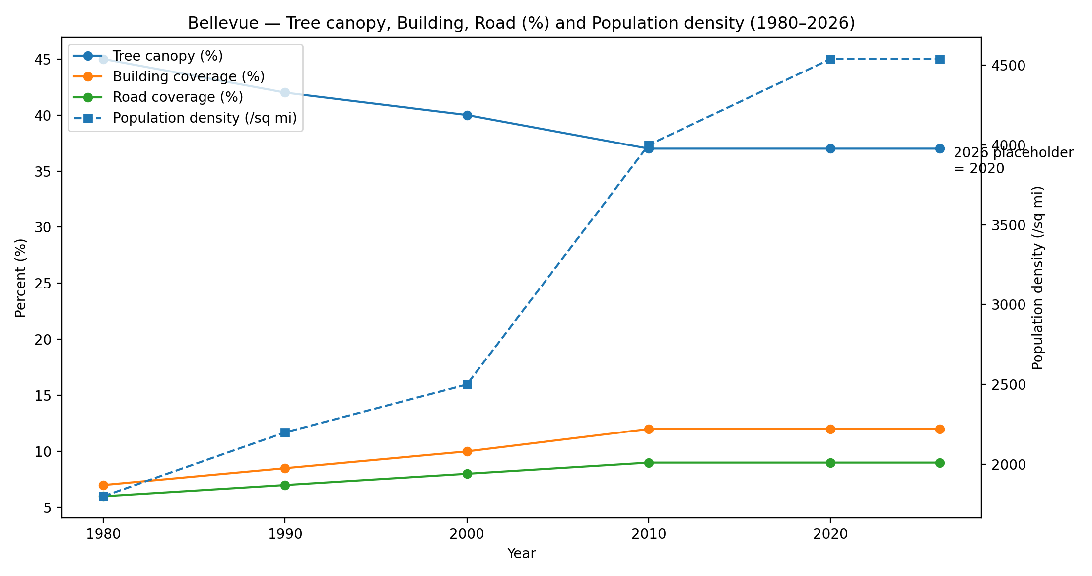 The chart below shows how Bellevue, WA has become more urban from 1980 to 2026. As population and development have increased, tree cover has declined—making it increasingly difficult for wildlife to survive.